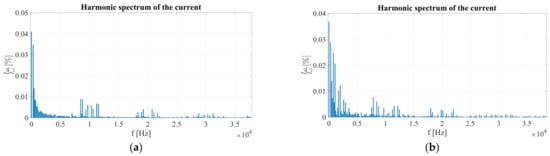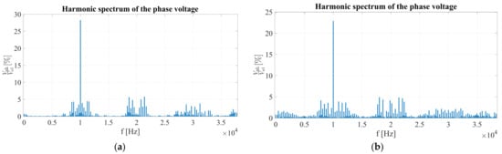 Figure 12 displays the harmonic components of the phase voltage waveforms and the motor’s supply current for both cases when the speed and the torque are set at their rated values. The graphs show the harmonics as a percentage of the first harmonic, both for voltage and current. In all the graphs, the first harmonic of current or voltage is not depicted because it is significantly greater than the higher harmonics.
