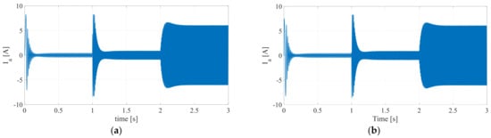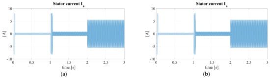 For completeness, Figure 14a,b shows the time trends of the stator currents when the drive is fed by a traditional and an asymmetric inverter configuration, respectively. As well as in the other reported results, the dynamics are not affected using ACHBMLI. In both cases, the root mean square value of the first harmonic of the current for the third operating is 3.9 A.