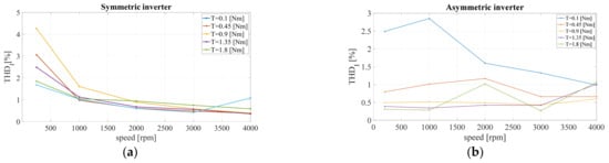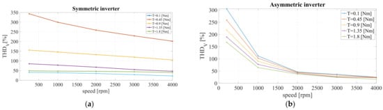 - For low values of speed and torque, the asymmetric inverter has greater performance regarding the THD% values; but, as the load torque increases, the THDI% becomes greater than the values of the traditional inverter. This is mainly due to the low-frequency harmonics generated by the asymmetric converter, which is shown in Figure 13b. The electric motor behaves as a low-pass filter and, as a consequence, is unable to filter out these harmonics.