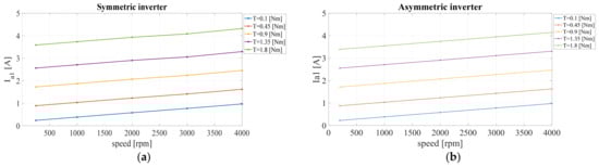 In Figure 17, the root mean square of the first harmonic of current Ia1 is presented for various operating conditions. In this case, Figure 17a,b are very similar to each other. In general, it can be asserted that the current increases with increasing speed for a given load torque and an increase in the load torque corresponds to an increase in the value of Ia1.