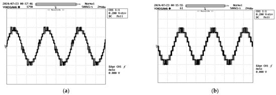 Line-to-line voltage seen through the oscilloscope (a) generated by the 7-level ACHBMLI; (b) generated by the 5-level CHBMLI.