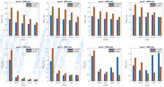 On the other hand, the THD% values referred to the current are much more comparable between ACHBMLI and CHBMLI. It can be highlighted that the advantage of applying AMLI is more evident for low-speed conditions, as lower THD% are achieved. However, for speed or load conditions close to the rated values, higher THDI% is detected, including low-order harmonics that could affect the motor performance in terms of torque ripple, leading to vibrations and disturbances. This fact can negatively impact the adoption of such a system in certain automotive applications.