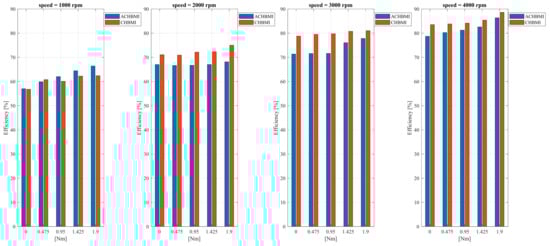 - As shown in Figure 27, in general, the symmetric converter exhibits better efficiency, except at 1000 rpm, where the asymmetric converter performs better. However, under all operating conditions, the efficiency of both converters remains comparable.