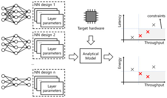 Figure 1 shows an overview of how the proposed analytical model can be used. A set of candidate neural network models, with various design parameter settings, is evaluated with the aid of a neural accelerator hardware model. The output, for each neural network model candidate with a specific set of design parameter settings, is the expected latency, throughput, and energy usage. If the user’s application has specific latency, throughput and energy usage requirements (shown by the blue dashed lines and gray region), then only a few designs (shown with red X marks) may meet the user’s requirements.