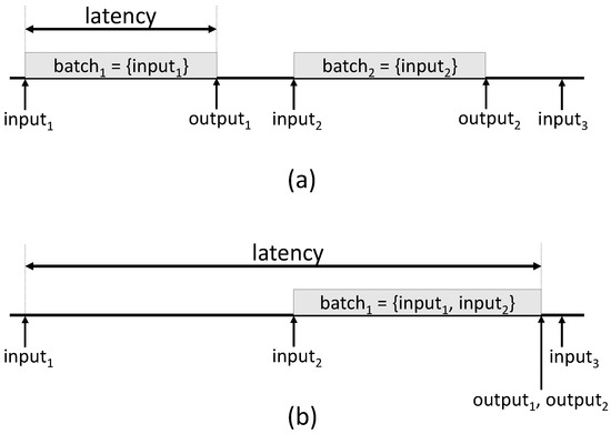 Two example scenarios are shown. Part (a), which uses batch size = 1, outlines an instance where the hardware completely processes an input (image) before the next input can be accepted. However, in part (b), which uses batch size = 2, the hardware waits until two inputs come in and processes two inputs at once.