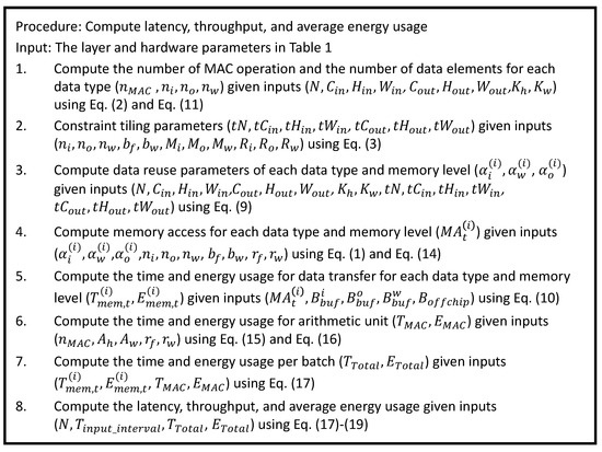 A step-by-step procedure for calculating latency, throughput, and energy usage using the proposed analytical model.