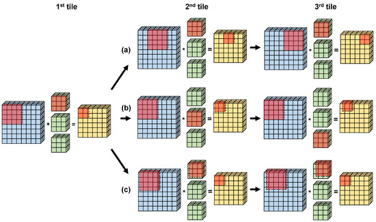 An example of different inter-tile data reuse patterns for a tiled 2D convolution is presented. The parameters are set as follows: , , , , , , and . For tiling, , , , and . The three paths marked as (a–c) illustrate different inter-tile reuse patterns, showing the sequences of tiles being computed. A neural accelerator reads input and output image pixels and weight values from off-chip memory to compute the first tile, marked in red in the leftmost part of the figure. In path (a), the weight values are reused in the second and third tiles, so the accelerator only reads input and output image pixels from off-chip memory. Similarly, in path (b), input image pixels are reused; in path (c), output image pixels are reused. Depending on which data the accelerator reuses, its data reuse characteristics will vary, thereby significantly impacting its performance.