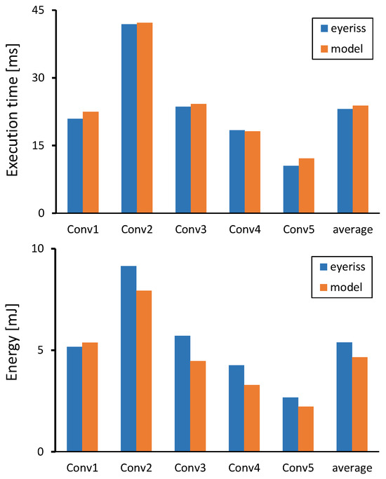 Figure 6 compares the execution time and energy usage values of AlexNet executed on the Eyeriss hardware, calculated using the proposed model, with the measurements obtained directly from the Eyeriss paper. The model accurately estimated the average execution time with an error of 3.33%. The maximum of the layerwise error was 15.61% and the mean was 5.58%. The correlation between the two was 0.998. For energy consumption, the model estimated the average energy consumption with an error of 13.54%. The maximum of the layerwise error was 22.60% and the mean was 15.66%. The correlation was 0.968. The reasons for the differences between the measured values of Eyeriss and the proposed model can be attributed to the differences in actual implementation details versus the general implementation methods assumed in the proposed model and Eyeriss.