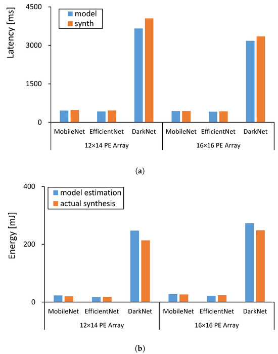 MobileNet, EfficientNet and DarkNet were used for the target neural network structure. MobileNet [29] and EfficientNet [30] are representative CNN structure that use depthwise and pointwise convolutional layers to conserve the total number of weight parameters that need to be used. DarkNet is the backbone neural network used for feature extraction in YOLOv3, a real-time object detection system. It is assumed that neither the feature maps nor the weights are pruned during the calculation process. The results of comparing the execution time and energy usage for each network are shown in Figure 7. Using the PE array, the percentage error averages for the three networks were 7.23% for execution time and 9.44% for energy usage, and 3.18% and 7.06%, respectively, for the PE array.