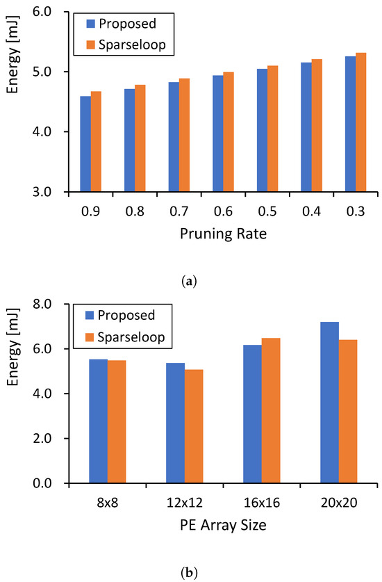 First, when the same hardware and neural network were used as inputs for the two models, the energy that changed depending on the pruning rate was compared. Eyeriss was used as the target hardware, and Alexnet was used as the target neural network. Figure 8a shows that the two methods similarly predict the energy reduction due to sparsity. The trends of the two methods are almost the same. The reason for the slight difference is that while Sparseloop assumes that the number of overhead bits that occur when compressing data with sparsity is fixed, the proposed model assumes that the number of overhead bits changes depending on the degree of sparsity.