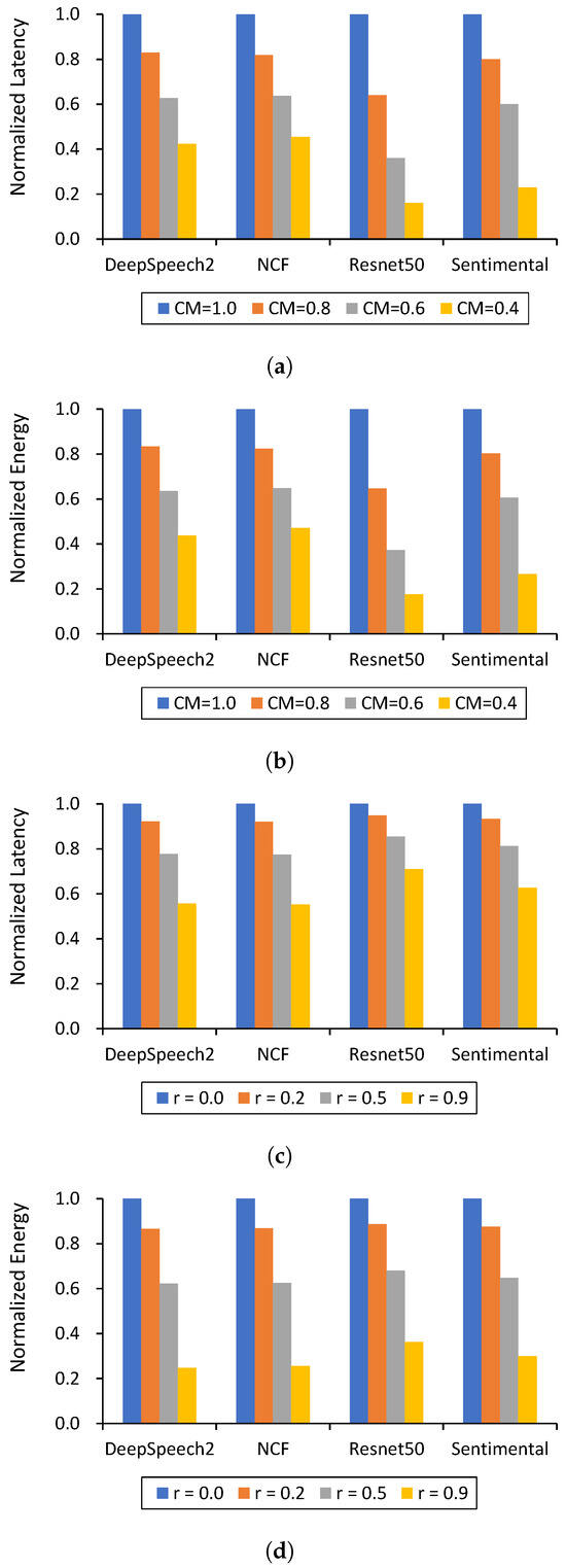 In particular, looking at the effect of the channel multiplier, it can be seen that the effect on execution efficiency varies significantly depending on the structure of the neural network even when the same parameter is changed. In the case of ResNet50, it is a neural network structure in which a general CNN layer is mainly used, and it can be seen that the execution time is proportional to the square according to the channel multiplier. On the other hand, in the case of Deepspeech and NCF recommendation systems, which consist of layers with relatively small computational intensity such as LSTM and fully connected layers, it can be seen that the execution time is approximately linearly proportional to the channel multiplier. Lastly, the results of the Sentimental seqCNN structure changed dramatically when the channel multiplier changed from 0.4 to 0.6. Such rapid changes are often seen in hardware with a hierarchical memory structure, such as the CPU’s cache. When the pruning rate changes, the graph shows that energy changes more than latency. This is because the number of accesses to memory, which has high energy usage, has been greatly reduced due to sparsity.