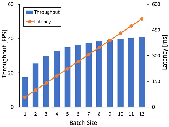 First, an experiment was performed to confirm the effect of batch size on throughput and latency. The difference in data reuse between different batch sizes is particularly significant when weight reuse is low. For example, in the case of a fully connected layer, reuse of weight data is considerably low because each weight value is used only once each time one batch is calculated. Figure 10 shows how throughput and latency values change with batch size for fully connected layers.