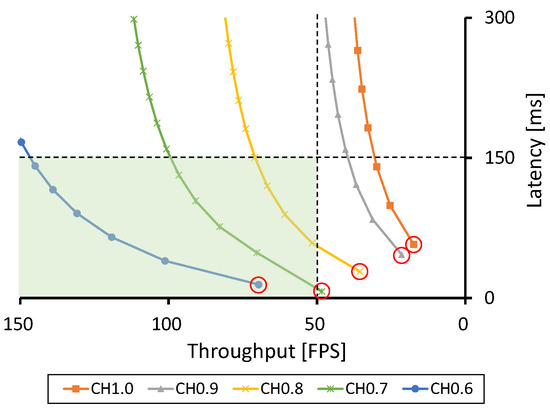 Throughput and latency with different channel multipliers and batch sizes. Each line represents the change in throughput and latency when the channel multiplier is fixed and the batch size changes. The red circle in each line represents the result when the batch size is 1, and each successive point in a line corresponds to an increase in batch size of 1. The green rectangular area shows the acceptable throughput/latency region.