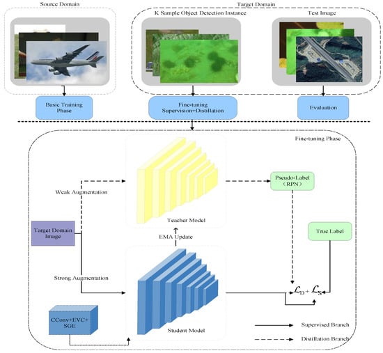 During the fine-tuning phase, we initially transferred the foundational detector weights to the student model for model initialization. Subsequently, we employed the standard detection [] supervision loss function to train the student model on k samples from each category’s target instance. The training weights were then fed back to both the student and teacher models, enabling them to engage in a synergistic joint training process. The teacher model refined the student model through the distillation branch loss function, while the student model updated the teacher model’s weights via Exponential Moving Average (EMA).