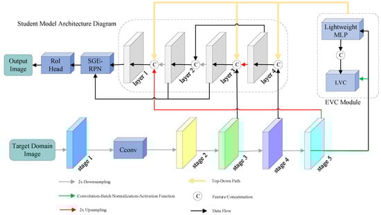 The architecture of the student model is depicted in Figure 2. The PConv and PWConv module is integrated into the feature extraction network, enabling a deeper processing of the initial image features. This results in a more refined feature mapping that is fed into the FPN. Additionally, EVC modules are incorporated into the network to enhance the interaction and aggregation capabilities of features across different layers. After the fusion of the feature afferents with the FPN, the SGE module is employed to enhance the grouping capabilities of the RPN, thereby efficiently screening and optimizing candidate regions. Ultimately, the optimized features undergo decoding and classification through the ROI header network, enabling the prediction of the target object and its associated attribute information within the image. The supervised detection loss function is presented in Equation (2), wherein LS represents the supervised branch loss function, and Lcls and Lloc denote the classification and regression loss functions, respectively. These are computed based on the prediction results xis from the supervised branch and the actual sample labels.