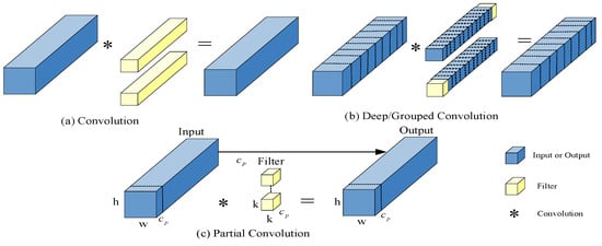 PConv employs a filter that selectively operates on a subset of the input features, leaving the rest of the channels unaltered, as depicted in Figure 3c. During the process of accessing sequential memory, the initial or terminal contiguous channels within the input feature graph are chosen for computation, ensuring that the input and output feature maps maintain an identical number of channels. The computational complexity of PConv is quantified by FLOPs (floating point operations per second), denoted as h × w × k2 × cp2, where h denotes the height, w signifies the width, k represents the number of kernels, and c indicates the number of channels of the feature map, respectively. If the value of the partial ratio is set to r = cp/c = 1/4, the required FLOPs amount to merely 1/16th of those needed for a full-channel convolution, thereby significantly enhancing computational efficiency. From Formula (6), it is evident that the module memory access is reduced to one-quarter of that required by traditional convolution.