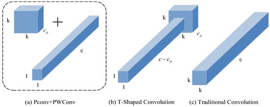 To ascertain the efficacy of feature extraction and computational efficiency in traditional convolution, T convolution, and combined convolution, we quantified the importance of each position for all the filters in the pre-trained ResNet50 [] model. The findings indicate that the significance of the central position’s weight surpasses that of the surrounding positions, aligning with the T-shaped structure’s emphasis on the central area’s information processing capabilities. Nevertheless, if the process can be broken down into two stages, the potential computational redundancy among filters can be substantially mitigated, thereby significantly decreasing the number of FLOPs needed for model computation without compromising the model’s performance. Given the same input I ∈ Rc×h×w and output O ∈ Rc×h×w, the FLOPs of the T-shaped convolution are computed to be h × w × (k2 × cp × c + c × (c − cp)), surpassing the FLOPs value h × w × (k2 × cp2 + c2) of the combined convolution. There exists a correlation between the number of parameters in both convolutions, denoted as (k2 − 1)c > k2cp. The conventional convolutional approach uniformly processes the entire feature region, failing to accentuate positions with more pronounced features. Consequently, the weights assigned are not meaningful, and the computational efficiency is inferior to that of T-shaped convolution and combined convolution.