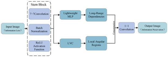 The lightweight multi-layer perceptron (MLP) is responsible for capturing the global long-range dependencies within the deep feature X4, effectively extracting the global contextual information. To preserve the local angular region information, a Learnable Visual Center mechanism (LVC) is incorporated to aggregate the feature information from local regions at the same level of X4. The features are smoothed by a stem block architecture that encompasses a 7 × 7 convolutional layer with 256 output channels, a batch normalization layer, and an activation function layer. The output Xin of the stem block is determined using Formula (7), wherein Conv7×7 signifies the 7 × 7 convolution operation with a stride of 1, and the channel count is established at 256 [] within the experimental setup. BN refers to the batch normalization layer, while σ denotes the ReLU (Rectified Linear Unit) activation function.
