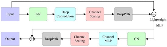 Within the residual module that employs deep convolution, the feature Xin, produced by the stem block, is fed into the deep convolutional layer. Following group normalization, the feature map is segmented into several subgroups along the channel dimension for normalization computations. This process enhances the representational power of the features and significantly alleviates the computational load. The incorporation of a channel scaling module and a DropPath module can more effectively leverage computational resources, enhance model performance, mitigate the overfitting phenomenon, and bolster the model’s generalization capabilities and robustness. Finally, the aforementioned operation is repeated, and the residual connection pertaining to the characteristic Xin is executed.