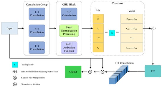 The LVC encoder module, as depicted in Figure 7, encompasses an internal dictionary and two principal components. These components are as follows: (1) The native code book B = {b1, b2, …, bk}, which embodies a collection of predefined features, with the aggregate spatial dimensions of these features being N = H × W, where H and W denote the height and width of the feature map, respectively. (2) The scale factor set S = {s1, s2, …, sk}. The feature Xin output by the stem block is convolved with kernels of size 1 × 1, 3 × 3, and 1 × 1, and the encoded result then undergoes deep feature extraction via a CBR (Convolutional-Batch Normalization-ReLU) block, which comprises a convolutional layer with 3 × 3 filters, a batch normalization layer, and a ReLU activation function. The extracted feature Xin is input into the intrinsic codebook for deep information interaction. By applying a series of predefined scale factors s, the components of feature XiD and feature bk are mapped to their respective location data. The information encapsulated within the k-th visual code word of an image can be derived using Equation (11). Here, XiD represents the i-th pixel of the image, bk denotes the k-th learnable visual code word, sk signifies the k-th scaling factor, XiD − bk embodies the pertinent information between the pixel and its corresponding code word, and K corresponds to the aggregate count of visual centers.