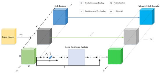 To adaptively modify the feature importance across various spatial locations within each semantic grouping, unique attention weights were assigned to each location across all the groups. This process enhances the model’s ability to learn expressions by reinforcing critical subfeatures, while simultaneously suppressing potential noise that could impact performance [], as depicted in Figure 8. This process necessitates minimal additional parameters and does not involve complex computational procedures. Instead, it operates by processing subfeatures in parallel, leveraging the similarity between global statistical features and local positional features to guide attention. Consequently, this approach enhances the features and yields a semantic feature representation that is evenly distributed across the spatial domain.