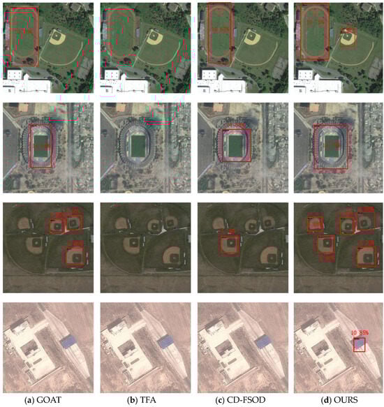 The prediction outcomes of the current approach, when compared with CD-FSOD, GOAT, and TFA, are depicted in Figure 9. It is evident from the figure that the current approach surpasses the other contrastive models in terms of both classification accuracy and localization accuracy. When the image encompasses multiple objects (as seen in the first line of Figure 9) or multiple objects of the same type (as depicted in the third line of Figure 9), this method can accurately detect all the objects within the image. The experimental results prove that the method has satisfactory results for the detection of target images. In contrast, TFA fails to detect any objects, while CD-FSOD and GOAT can only identify some of the objects, resulting in a certain degree of omission. For the objects that are detected, the boundary box positioning accuracy and recognition confidence of these two methods are inferior to those of the present method. When the background noise within the image data is excessively high (as seen in the second row of Figure 9), the positioning accuracy of this method is markedly superior to that of the other methods. The converse is true when the significance of features within the image’s object apart from the color are considered (refer to the fourth row of Figure 9).