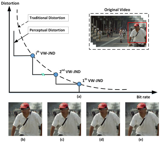 In video coding, the relationship between the traditional distortion and bit rate is a continuous curve (shown as the dotted line in Figure 1); however, the HVS can only perceive several perceptual distortion levels in a big range of coding bit rates [34] (shown as the solid line in Figure 1). The jump point between two adjacent perceptual distortion levels is VW-JND points, which means that the distortion of the compressed video with a bit rate larger than cannot be detected by HVS; otherwise, the compression distortion will be perceived. At a given perceptual distortion level, the compressed video located VW-JND point has the best quality and minimal bit rate relative to its reference, therefore VW-JND prediction model can be used to select encoding parameters in compression and to select compressed video with the best quality and minimal transmission bandwidth for consumers in stream service. In video coding, the Quantization Parameter (QP) (ranging from 0 to 51) controls the bit-rate allocation and determines the compression distortion, in which a smaller QP denotes better quality and higher bit rate. Figure 1b shows the quality of the original video, and Figure 1c–e shows the quality of the first, second, and third VW-JND, of which the references are the original video, first ground truth, and second ground truth VW-JND, respectively. The existing VW-JND prediction methods [24,25,26,27] modeled the VW-JND prediction problem as a regression problem, which predicted a series of SUR values for compressed videos, resulting in a relatively higher inferring complexity. Moreover, the SUR predictor in the models is usually hard to train due to the smaller number of labeled data samples. Most of the existing methods [24,25,26] are based on handcrafted features rather than that learned by deep learning, which results in a relatively weak feature representation ability. Inspired by [27,28], we proposed the classification-based VW-JND prediction model (i.e., BD-VW-JND-PM) to reduce the inferring complexity, the PLLP-CV to identify whether the compressed video is perceptual lossy to its reference by learning the spatial and temporal distortion features.