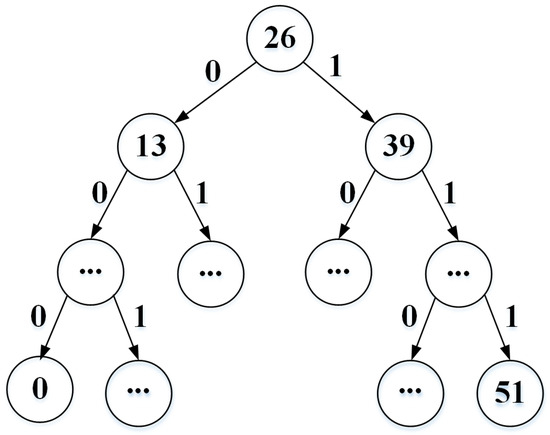 Since QP values are discrete and limited in video coding and the compression distortion increases when the QP becomes larger, we construct a Binary Sort Tree (BSD) of QPs for VW-JND prediction. In the constructed BST, the root point QP is , left children point QP is , and the right children point QP , where , , , denote the reference QP, the largest QP, and its parent QP. Figure 2 shows an example of QP BST for the first VW-JND prediction, where is 0 and is 51. The right child point QP is larger than its parent QP, which means the distortion of the right point is larger than its parent. The parent point is larger than the left child QP, which means the distortion of the parent point is larger than that of the left child If the distortion of the parent point is perceptually lossy (1/0 denotes perceptually lossy/lossless) relative to its reference, the VW-JND will not be located in the right child tree; otherwise, it will not be located in the left child tree. Therefore, the VW-JND prediction task can be modeled as a binary decision process, and we propose BD-VW-JND-PM. The computation complexity of the VW-JND prediction methods solved by SUR regression [24,25,26,27] and classification in a sequential decision process [28] is , while n denotes the number of QPs in the searching space. However, the average time complexity of the proposed BD-VW-JND-PM is , which is lower than that in [24,25,26,27,28].