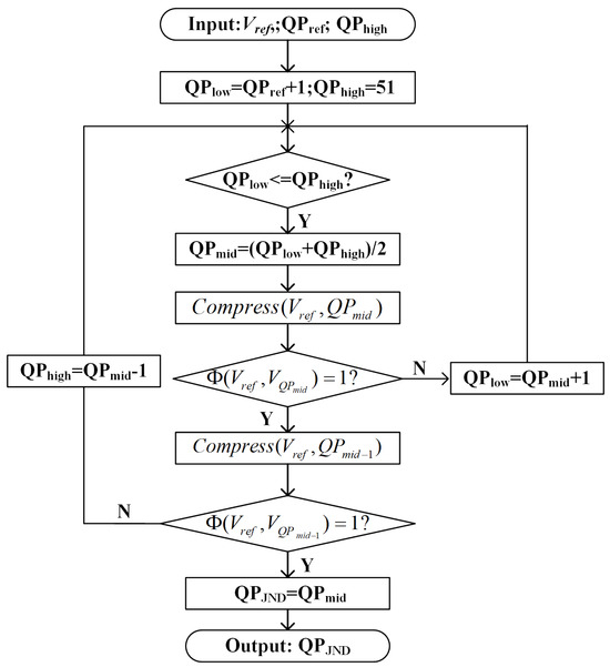 The flowchart of the proposed BD-VW-JND-PM is shown in Figure 3; the inputs include reference video , QP of , and , denoting the upper QP in compressing, and the is assigned 0 when is the original video. The VW-JND (QP) is predicted in the range ; therefore, and are initiated as and 51, respectively. is the middle QP between and , when the , it means that there is more than one candidate; we search VM-JND until it is found. We compressed the with and take the PLLP-CV proposed in Section 4 to predict whether is perceptually lossy relative to or not, where the prediction results 1 and 0 denote is perceptually lossy and lossless, respectively. When the prediction result of is 0, it means the VM-JND will located in [, ] where the quality of compressed video is worse than , and we update the searching space by setting . When the prediction result of is 1, there are two possible cases: One is that is the VW-JND video if is perceptually lossless relative to ; therefore, we predict the VW-JND as and output the prediction result. The other is that the VW-JND are located in [, ], in which the compressed videos have a better quality than , and we update the searching space by setting . The corresponding algorithm is shown in Algorithm 1.