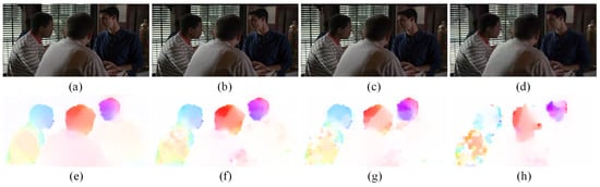 Humans can perceive the video content and motion information in viewing videos, therefore the video content distortion (spatial distortion) and motion distortion (temporal distortion) should be taken into account in VW-JND prediction. Since the video motion can be well captured by the optical flows computed between each pair of adjacent frames, which have been widely used in video processing and video quality assessment [36]. Therefore, we take the distortion of optical flows as the motion distortion for videos. Figure 4 shows the spatial and temporal distortion of the compressed video with different QPs. When the QP increases, not only does the content distortion increase (see Figure 4a–d) but so does the optical flow distortion (see Figure 4e–h), which means that the compressed distortion affects both of the spatial and temporal distortion of the compressed videos. It is necessary to take the spatial and motion distortion into the proposed PLLP-CV used to identify whether the distortion of the compressed video is perceptual lossy or not.