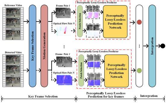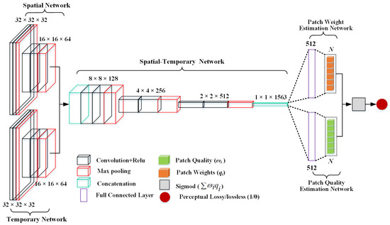 Inspired by [27,38], we propose ST-Network-PLLP to predict whether a compressed frame is perceptually lossy relative to its reference or not by learning the spatial–temporal features. It will output label “1” if the distortion of the frame is predicted to be perceptually lossy; otherwise, it will output label “0”. Figure 6 shows the architecture of the proposed ST-Network-PLLP; the selected key frame with its corresponding optical flow map is split into content patches and optical flow patches. The content patches and optical flow patches are fed into the spatial network and temporal network to extract low-level spatial features and temporal features, which are then concatenated and fed into the spatial–temporal network to extract the spatial–temporal features. The obtained spatial–temporal features were used by the patch weight estimation network to estimate the patch weight, and they were used by the patch quality estimation network to measure the patch quality. Finally, the perceptual loss/losslessness is obtained by weight-pooling the patch weight and patch quality.