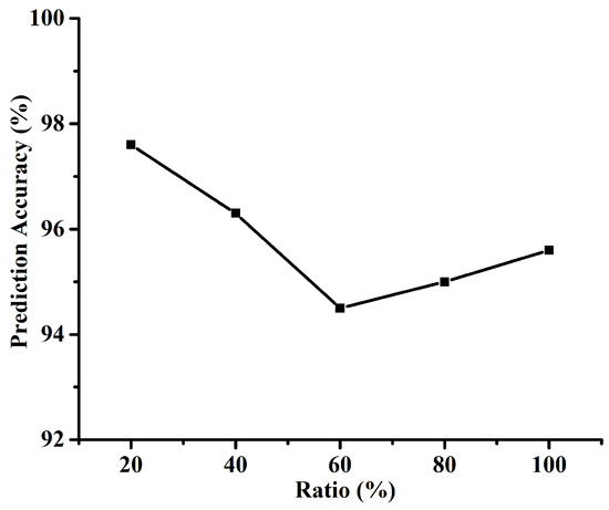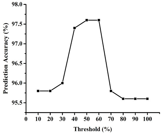 where is the predicted perceptually lossy/lossless label (1/0) of the ith frame, n is the number of selected frames for a video. Equation (3) means that the compressed video will be predicted perceptually lossy (i.e., ) if the number of selected frames predicted with perceptual loss () is larger than threshold denoting the percentage of key frames. We determine the parameter by experiments, where were tested, and the test results are shown in Figure 8. It can be seen that the prediction accuracy of (40%, 50%, 60%) is higher than that of (10%, 20%, 30%) and (70%, 80%, 90%, 100%), since too small thresholds and too large thresholds mean the conditions are too easy or too hard to meet, and the thresholds in the middle range are suitable for the proposed model. Therefore, we select in this work due to its highest prediction accuracy.
