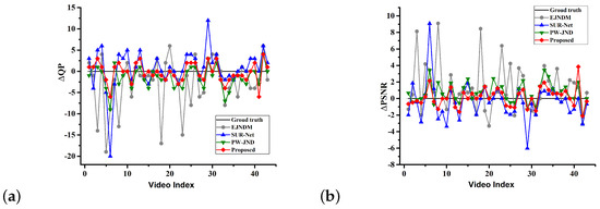 Figure 9 shows the prediction error in QP (Figure 9a) and PSNR (Figure 9b) for each video in the test data set , where the bar line (QP = 0), circle line, up triangle line, down triangle line, and diamond line denote the ground truth, EJNDM, SUR-Net, PW-JND, and the proposed model in this work, respectively. It can be seen from Figure 9a that the EJNDM has many points far away from the bar line, which means EJNDM has a large VW-JND prediction error in many videos. SUR-Net has a smaller number of points away from the bar line than that of EJNDM, which means SUR-Net has a better performance than EJNDM. For PW-JND and the proposed model, there is no point far away from the bar line, which means the two models have small prediction errors for all of the test videos. Therefore, PW-JND and the proposed model have better performance than that of EJNDM and SUR-Net. For the proposed model, almost all of the points are closer to the ground truth than that of the PW-JND model, which means the proposed model performs better than PW-JND. Moreover, all of the |QP| for the proposed model (except one) are located at 1 or 2, which shows an effective application. We can also see a similar phenomenon in Figure 9b. Therefore, it can be also concluded that the deep learning-based models have better performance, PW-JND performs better than SUR-Net, and the proposed model performs best.