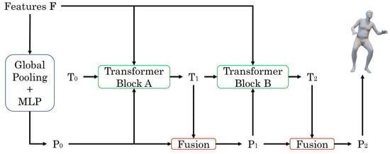 - Lin, K.; Wang, L.; Liu, Z. End-to-End Human Pose and Mesh Reconstruction with Transformers. In Proceedings of the IEEE Conference on Computer Vision and Pattern Recognition (CVPR 2021), Virtual Event, 19–25 June 2021; IEEE: Piscataway, NJ, USA, 2021; pp. 1954–1963. [Google Scholar]