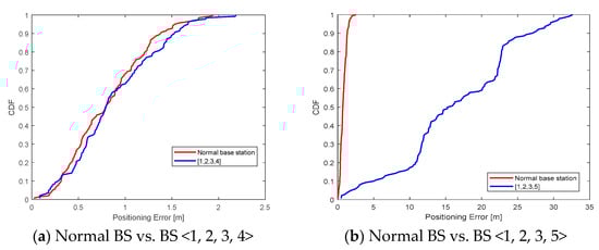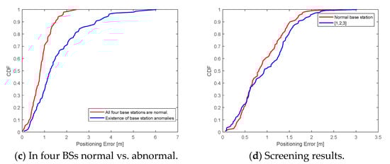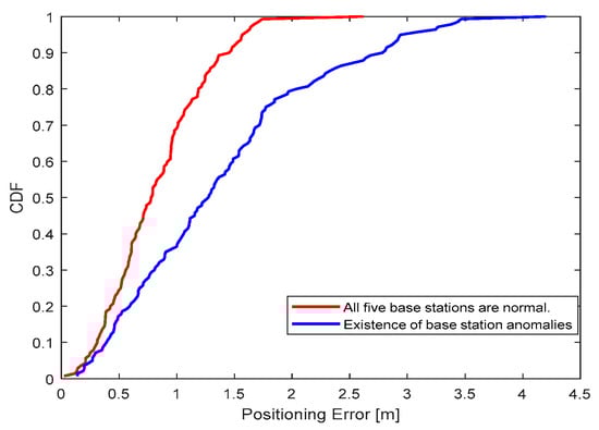 In order to verify the effectiveness of the algorithm, NLOS influence is added to one of the base stations, and to facilitate the comparison of the experimental results, we masked the fifth base station as an abnormal base station. Then, the localization under the conditions of all five base stations being normal and the fifth base station being abnormal were carried out, and their localization CDF plots were obtained, as shown in Figure 4.