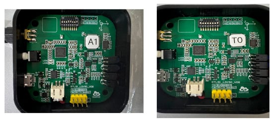 In this experiment, the DW1000 is used as the core UWB chip, and an STM32F103CBT6 microcontroller is used as the main control MCU. The DW1000 is manufactured by Decawave, based in Dublin, Ireland. STM32F103CBT6 microcontroller is manufactured by ST, a multinational company based in Paris, France. It supports six frequency bands from 3.5 G to 6.5 G; the maximum distance is 150 m; the module size is 60 × 60 × 20 mm; the ranging accuracy is ±5 cm; the max communications rate is 6.8 Mbps; and synchronization between UWB stations is required. The MEMS hardware utilizes the MPU9250, which contains a three-axis accelerometer and a three-axis gyroscope. The MPU9250 is manufactured by Invensense, a company based in Sunnyvale, CA, USA. The features of the MPU9250 are as follows: the gyroscope (gyro) full-scale range is ±2000°/s; the gyro rate noise is 0.01 dps/Hz; the gyro operating current is 3.2 mA; the accelerometer (accel) full-scale range is ±16 g; the accel sensitivity is ±4800 LSB/g; and the accel operating current is 450 uA. The device is shown in Figure 3.