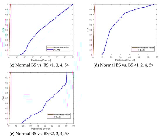According to our proposed abnormal base station identification algorithm, following the steps of the algorithm, five sets with four sub-base stations are first selected from five base stations, and the base stations contained in the five sub-base station sets are <1, 2, 3, 4>, <1, 2, 3, 5>, <1, 3, 4, 5>, <1, 2, 4, 5>, <2, 3, 4, 5>, and <2, 3, 4, 5>, respectively. We have determined through several experiments that the optimal threshold for the empirical parameter is around 0.2. A threshold that is too large will result in base stations in the set containing abnormal base stations, while a threshold that is too small will result in a failure to screen normal base stations. Figure 5 shows the CDF of the five sub-base station ensemble localization against the normal CDF. It can be intuitively seen that when the <1, 2, 3, 4> sub-base station is used for localization, its maximum point-by-point distance from the CDF localized by the normal base station is 0.11, which is smaller than the set threshold value of 0.2; thus, <1, 2, 3, 4> can be regarded as the normal base station. As for the remaining four sub-base station sets, their maximum point-by-point distances are 0.95, 1, 1, and 1, which are all greater than the set threshold. Thus, only one sub-base station is the required base station set in this experiment, and hence base stations 1, 2, 3, and 4 can be identified as robust base stations, which is also consistent with the fact that we masked the fifth base station as the abnormal base station. If all sets do not obtain results less than the threshold, it means that there are still anomalous base stations. We will reduce the number of merged base stations and continue to use the algorithm to detect anomalous base stations until the result is obtained or there are fewer than three base stations in the base station subset. When more than one consistent BS subset is detected, showing that these BS subsets are normal, we choose combinations with more evenly spaced base stations.