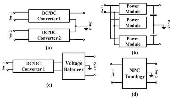 Several solutions are generally considered in the unipolar/bipolar DC grid conversion, including (a) system configuration; (b) input-parallel-output-series (IPOS) topology; (c) integrated-balancing bipolar circuit; and (d) neutral point clamped (NPC) circuit, as shown in Figure 2. Although the power supply continuity can be guaranteed, the neutral point can be created by cascading two converters at the cost of high initial investment and bulky volume. The IPOS structure is another candidate solution for achieving power transmission between DC grids with unipolar and bipolar configurations. In [10,11], an IPOS converter structure was proposed based on the dual active bridge (DAB) modules. However, due to the large number of isolated transformers in this topology, the insulation design and heat dissipation requirements are more rigorous. A triple-active-bridge converter associated with a multi-winding transformer was introduced in [12] to create a bipolar port with less active components. Unlike the topology presented in [12], a BiSAB converter with a semiactive rectifier was proposed to save the system’s cost [13]. These two solutions are specially designed for low-voltage (LV) microgrids. Reference [14] presented another IPOS approach using two modular multilevel DC converters (MMDCs) to achieve unipolar-to-bipolar power conversion. Notably, current- and voltage-sharing issues always challenge the IPOS’s normal operation with either the DAB or the MMDC topologies [15]. To prevent current- and voltage-sharing issues, another method based on the isolated MMDC converter with a central-tap was proposed for unipolar-to-bipolar conversion [16]. However, the square-wave modulation will result in a large dv/dt and high-order harmonic content on its AC side.