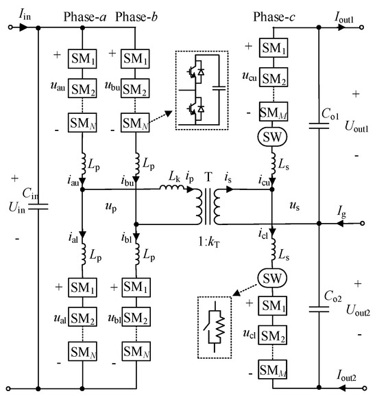 The proposed IMMDC topology is depicted in Figure 3, specially designed for the offshore wind power HVDC transmission system with different voltage levels and configurations. In this topology, an H-bridge MMC structure forms on its unipolar (primary) side, and the bipolar (secondary) side contains a half-bridge MMC structure. Each arm on the primary side comprises N full-bridge submodules (SMs) and an arm inductor. The counterpart of the secondary side consists of M half-bridge SMs, an arm inductor, and a SW valve connected in series. The valve is composed of a mechanical switch and a current-limiting resistor. When the bipolar side operates symmetrically, the mechanical switch is turned on, and the current limiting resistance is bypassed. The neutral line of the bipolar side is drawn from the point between the two output capacitors.
