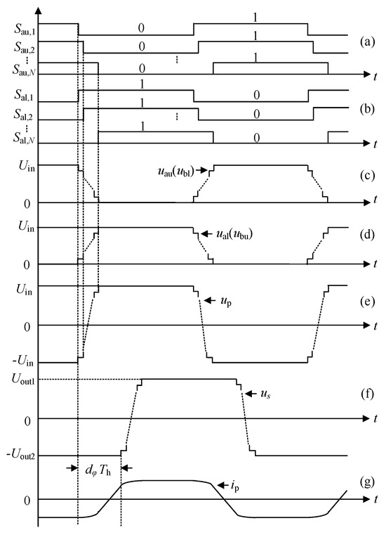 Figure 4 shows the relevant waveforms of the IMMDC under symmetrical operation. In Figure 4a,b, the waveforms of Sau,j and Sal,j (j = 1, …, N) are the switching signals of Phase-a upper and lower arms j-th submodule. The upper and lower arm voltages of Phase-a are depicted in Figure 4c and d, respectively. Under this condition, the positive voltage Uout1 equals to the negative voltage Uout2. In the quasi-two-level modulation strategy, the upper and lower arms of the MMCs on both primary and secondary sides adopt complementary switching, and the AC voltage magnitudes are equal to that of the DC voltage. The primary- and secondary-side AC voltages, up and us, are shown in Figure 4e and f, respectively. Similar to the DAB converter, the ratio of the phase shift angle φ between the AC voltages of the primary and secondary sides to π is defined as the power-shift ratio dφ, and Th is half of an operation cycle. The transmission power P is controlled by adjusting the power-shift ratio dφ. Figure 4g illustrates the AC current of the transformer.