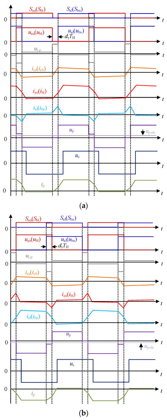 From Equation (3), when (Ual − Uau) is greater than (Ubl − Ubu), a positive DC voltage component can be added to up. Similarly, when (Ual − Uau) is smaller than (Ubl − Ubu), a negative DC voltage component will be injected on up of the primary side. The arm inductances are used as an energy-storage element to inject AC current into the upper and lower arms, creating a power exchange path for the arm voltage amplitude adjustment.