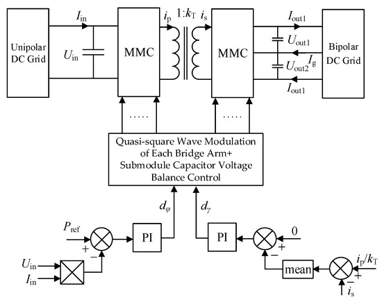 Figure 6 depicts the control diagram of the IMMDC, containing four parts: (1) transmission power controller; (2) magnetic balance controller; (3) arm submodule capacitor voltage balance control; and (4) quasi two-level modulation. The transmission power controller tracks the transmission power reference value Pref. The power-shift ratio dφ is obtained from the PI controller, shifting the phase of the gating signals of the switching devices in the SMs of the Phase-c arms. is and ip are sampled and compared to calculate the magnetizing current im. The actual im will be compared with zero to obtain the input signal of another PI controller, such that the corresponding inter-arm shift ratio dγ of Phase-a and b can be obtained. The quasi-two-level modulation can add a small phase shift between the adjacent gating signals in the same arm to regulate the dv/dt on both the primary and secondary sides of the isolation transformer. The SM capacitor voltage balance control has been well developed in [24,25], which will be discussed in detail in this paper.