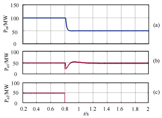 Two scenarios are considered to verify the effectiveness and feasibility of the proposed topology and corresponding control schemes: (1) normal condition with 100 MW transmission power and (2) negative pole open-circuit fault. Figure 7 illustrates the corresponding transmission power of the proposed IMMDC. The subfigures are labelled as (a)–(c), where Figure 7a presents the input port active power, and Figure 7b,c show the power transferred by the positive and negative poles, respectively. Before the fault is triggered, the power can be transferred normally from the unipolar side to the bipolar side. The fault is set at 0.8 s. After 0.8 s, the fault-tolerant control strategy is activated to generate the desirable injected DC current. Under this condition, the negative pole cannot maintain its power-transfer capability, where the curve drops from 50 MW to 0 MW, as shown in Figure 7c. Owing to the proposed fault-tolerant scheme, the power on the positive pole drops from 50 MW to 25 MW rapidly and then gradually restores to 50 MW, as illustrated in Figure 7b. Accordingly, the total transmission power P decreases from 100 MW to 50 MW, as depicted in Figure 7a.