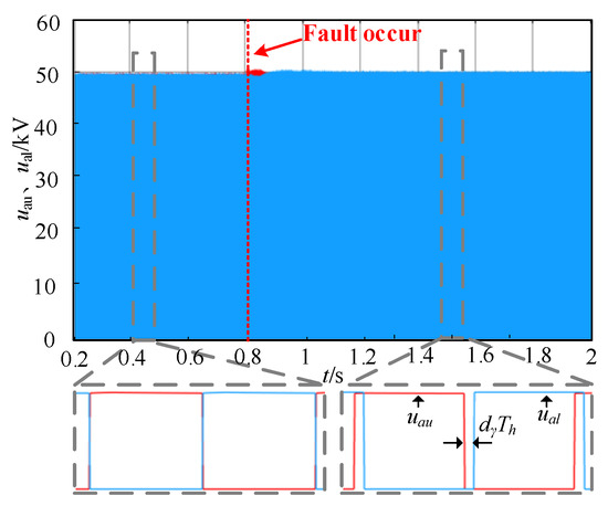 Figure 8 illustrates the Phase-a arm voltages of the primary side. The arm voltages operate complimentarily before the fault is tripped, where Uau equals Ual. After the fault occurs at 0.8s, a phase shift dγTh between the upper and lower arm of Phase-a is introduced according to the proposed fault-tolerant scheme. In Figure 8, a slight distortion can be found in the upper arm voltage after the fault occurrence due to the unbalanced magnetic flux of the MFT. Under this condition, the upper arm voltage Uau is slightly larger than the counterpart Ual of the lower arm.