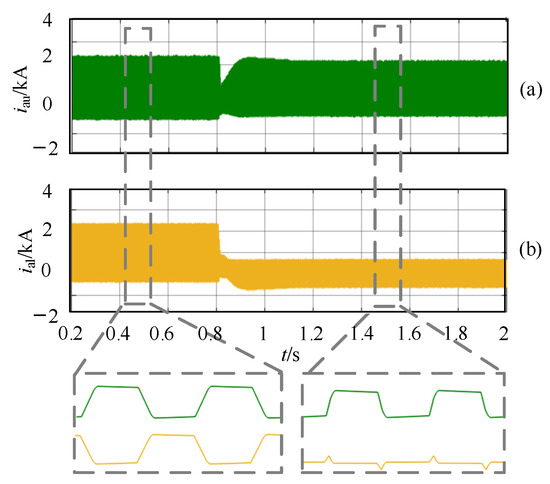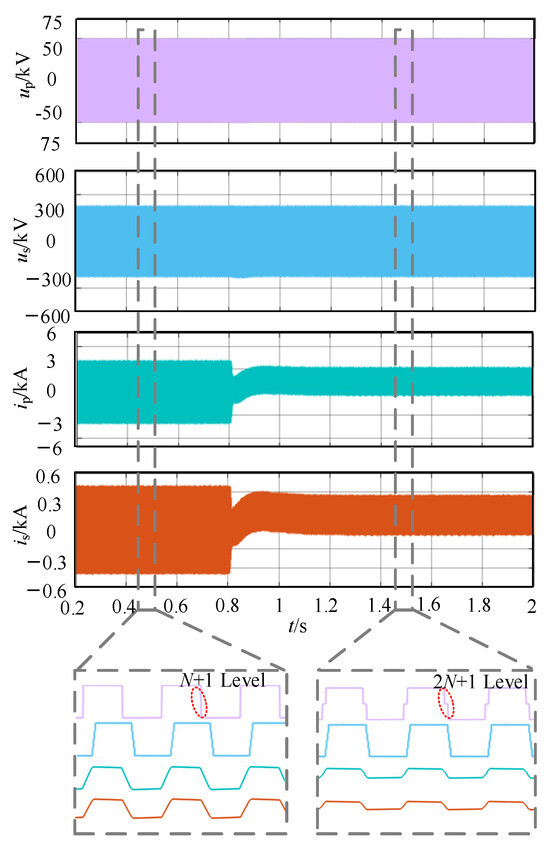 Figure 11 illustrates the voltage and current waveforms of the isolation transformer’s AC side before and after the disconnection of the negative pole. Before the disconnection, the rising and falling edges of the primary-side AC side voltage are (N + 1) level staircase waves, and the primary and secondary-side AC currents do not contain DC components. After the negative pole disconnection, the rising and falling edges of the primary AC side voltage comprise (2N + 1) levels, where DC components appear in the primary and secondary AC side currents.