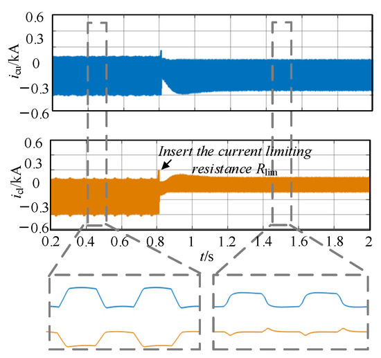 In other words, the voltage over Co2 (uCo2) will no longer increase during the steady state. The average values of uCo1 and uCo2 are not equal as well, leading to the difference in voltage magnitude of the upper and lower arms of Phase-c. Moreover, the reactive circulation current will be introduced between the upper and lower arms, increasing the current stress of the arms [23]. Therefore, when the negative pole of the secondary side is disconnected, the Phase-c lower arm’s mechanical switch inside the SW valve will be turned off, and the current limiting resistor will be inserted to stop the capacitor Co2 from charging. Thus, the arm current can be effectively suppressed.