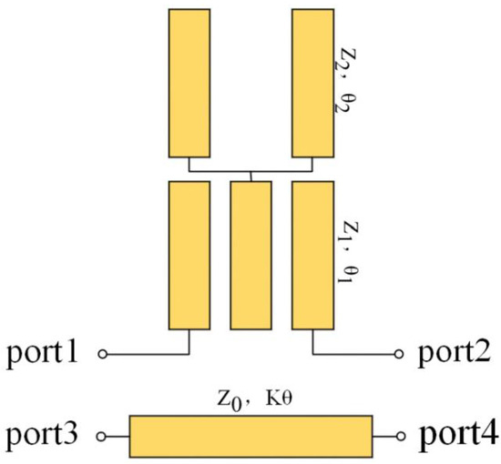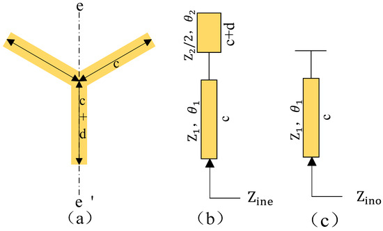 Figure 2 shows a schematic diagram of the Y-type microstrip dual-mode resonator with an odd–even mode resonance equivalent circuit. From Figure 2a, it can be seen that the resonator is symmetric about ee, the odd-mode excitation in the symmetry plane will be shorted, and the odd-mode resonance equivalent circuit is shown in Figure 2c. The characteristic impedance can be defined as follows: