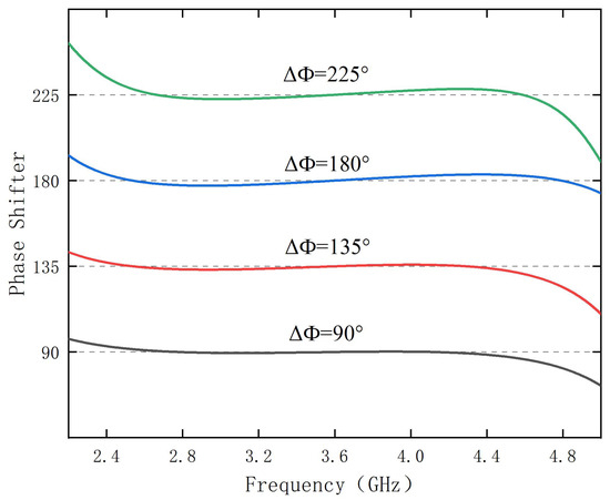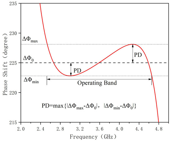 For an ideal phase shifter, the phase difference between the main line and the reference line is constant over a frequency range, i.e., the phase shift value is constant. In practice, the phase difference between the two is somewhat variable over a range of operating frequencies. Assuming that the calibration phase shift value is , the maximum phase shift value in the working band is , and the minimum phase shift value is . As shown in Figure 4, the phase deviation (PD) is defined as the maximum difference between the phase shift value and the calibration phase shift value in the working band: