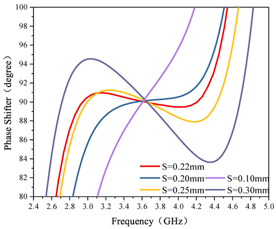 The ABCD matrix of the reference line is brought into Equation (6) to obtain the insertion phase shift of the reference line and, hence, the phase shift value of the phase shifter. The phase response for different phase shift values is shown in Figure 5. The phase shifter proposed in this paper achieves wide broadband and low phase deviation for different values of phase shift. It can be seen from the figure that the phase deviation increases gradually as the phase shift value increases from 90° to 225°. When the phase shift value is 90°, the fractional bandwidth can reach 60.8%, and its phase deviation is less than 1.2°. A wide bandwidth can be realized with a smaller phase deviation and a simpler structure. In general, the phase response of a wideband phase shifter is highly sensitive to the coupling distance. Figure 6 illustrates the relationship between coupling distance and phase response, indicating that as the coupling distance decreases, both the phase shift bandwidth and phase shift deviation reduce. Conversely, increasing the coupling distance leads to a broader phase shift bandwidth but also increases the phase shift deviation. Specifically, when the coupling distance is set to S = 0.20 mm, the phase shift bandwidth becomes too small. At S = 0.25 mm, while the phase shift bandwidth increases, the phase shift deviation exceeds 2°, which does not align with the design objectives. After carefully balancing the phase shift bandwidth and deviation, the optimal coupling distance is determined to be S = 0.22 mm.