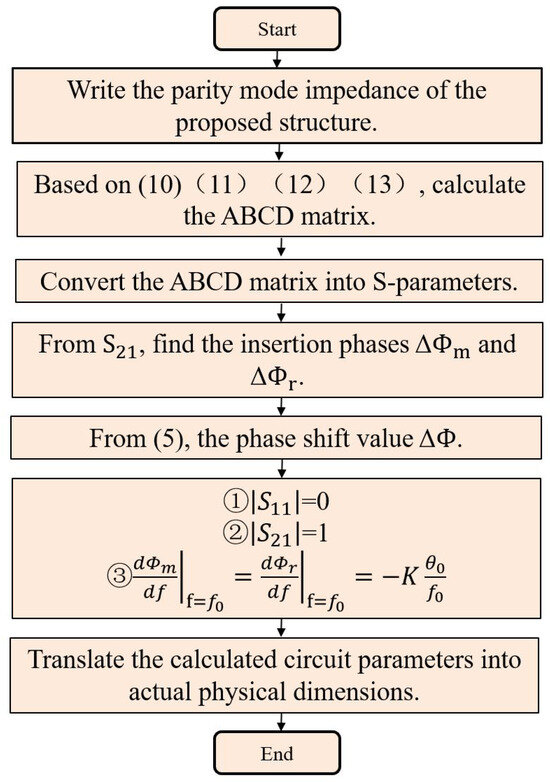 The design flow chart is shown in Figure 7: (1) Draw the corresponding odd-mode and even-mode circuits based on the structure of the proposed filter phase shifter; (2) Using your knowledge of microwave theory, write the input impedances corresponding to an odd-mode circuit and an even-mode circuit, noted as and ; (3) Find the S-parameters from the reflection and transmission coefficients with respect to the odd/even input impedance with the ABCD matrix; (4) Write the reflection coefficient , transmission coefficient , and insertion phase of the network based on the conversion relationship between the ABCD matrix and the scattering parameter; (5) The insertion phases of the main and reference networks are operated as a difference to derive the phase shift value ; (6) First-order differentiation of the insertion phase such that the slopes of the insertion phases of the two networks are the same in the operating frequency band; (7) Determine component parameter values using , , and steps (5) and (6); (8) Based on the parameters of the selected dielectric substrate (substrate thickness, dielectric constant, and loss angle tangent), the calculated circuit parameters (characteristic impedance and electrical length) are converted to actual physical dimensions using closed-form equations; (9) The physical dimensions of the phase shifter are slightly adjusted using simulation software. With this design step, the designed 90°, 135°, 180°, and 225° equivalent circuit parameters, as well as physical dimensions, can be obtained, as shown in Table 1.